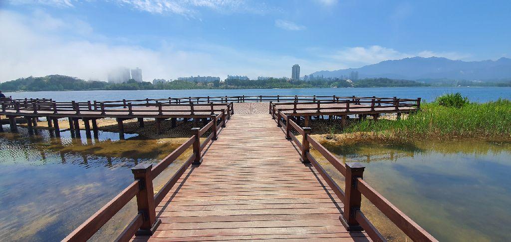 - 영랑호수 위를 가로지르는 목재 데크길