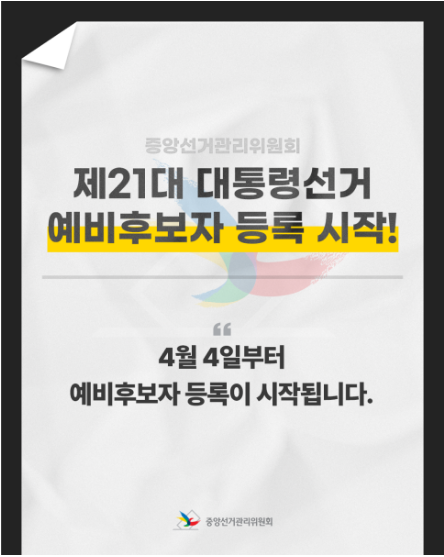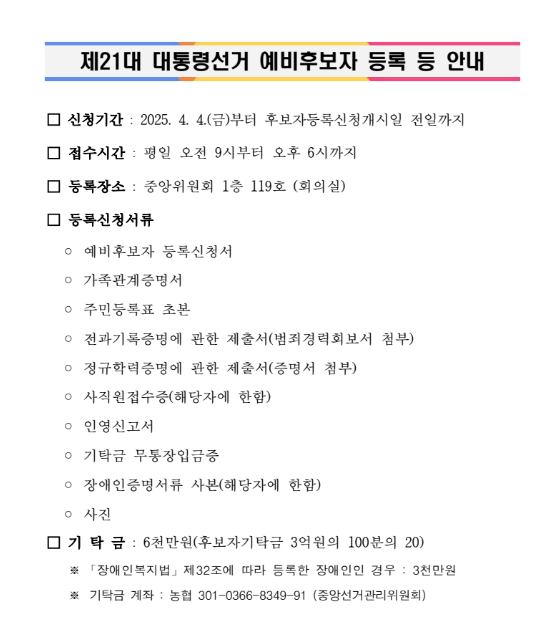| 예비후보자 등록 시작 | 2025년 4월 4일 | 선관위 등록 개시 |
